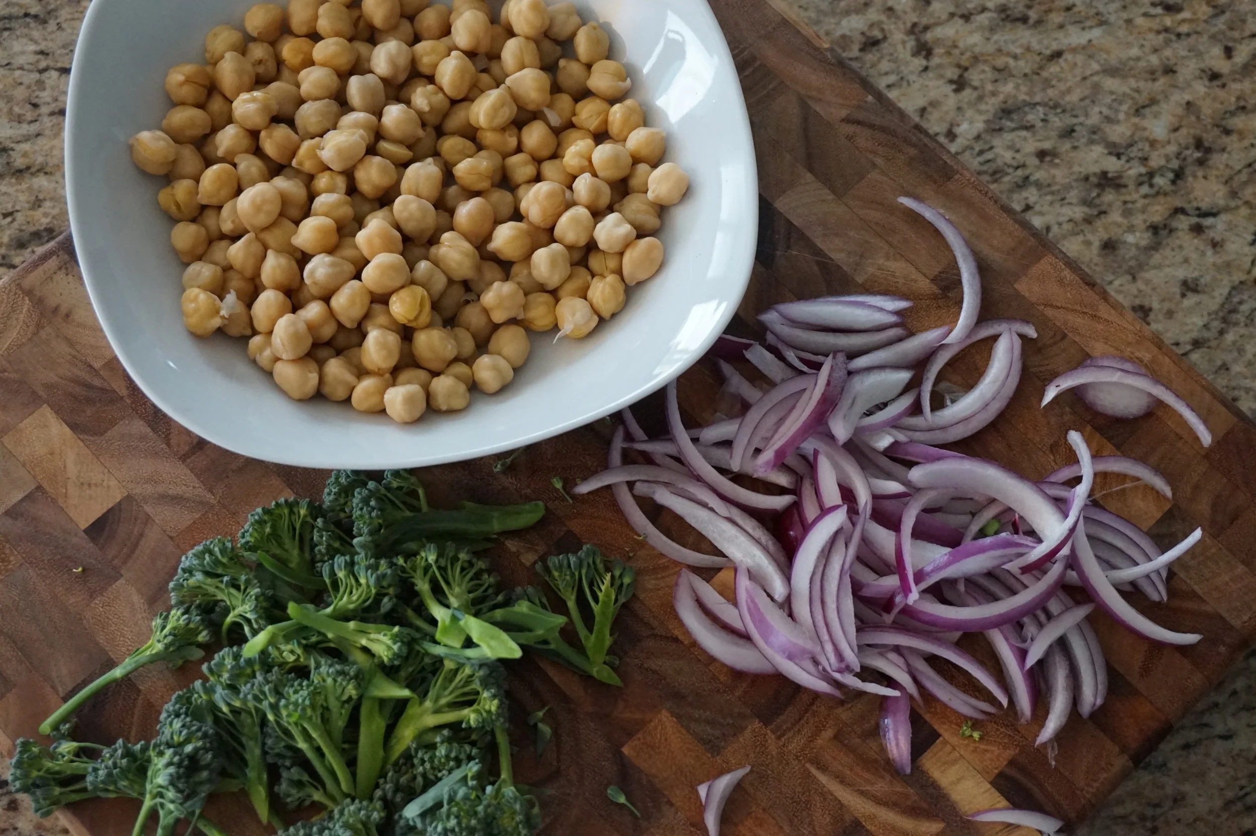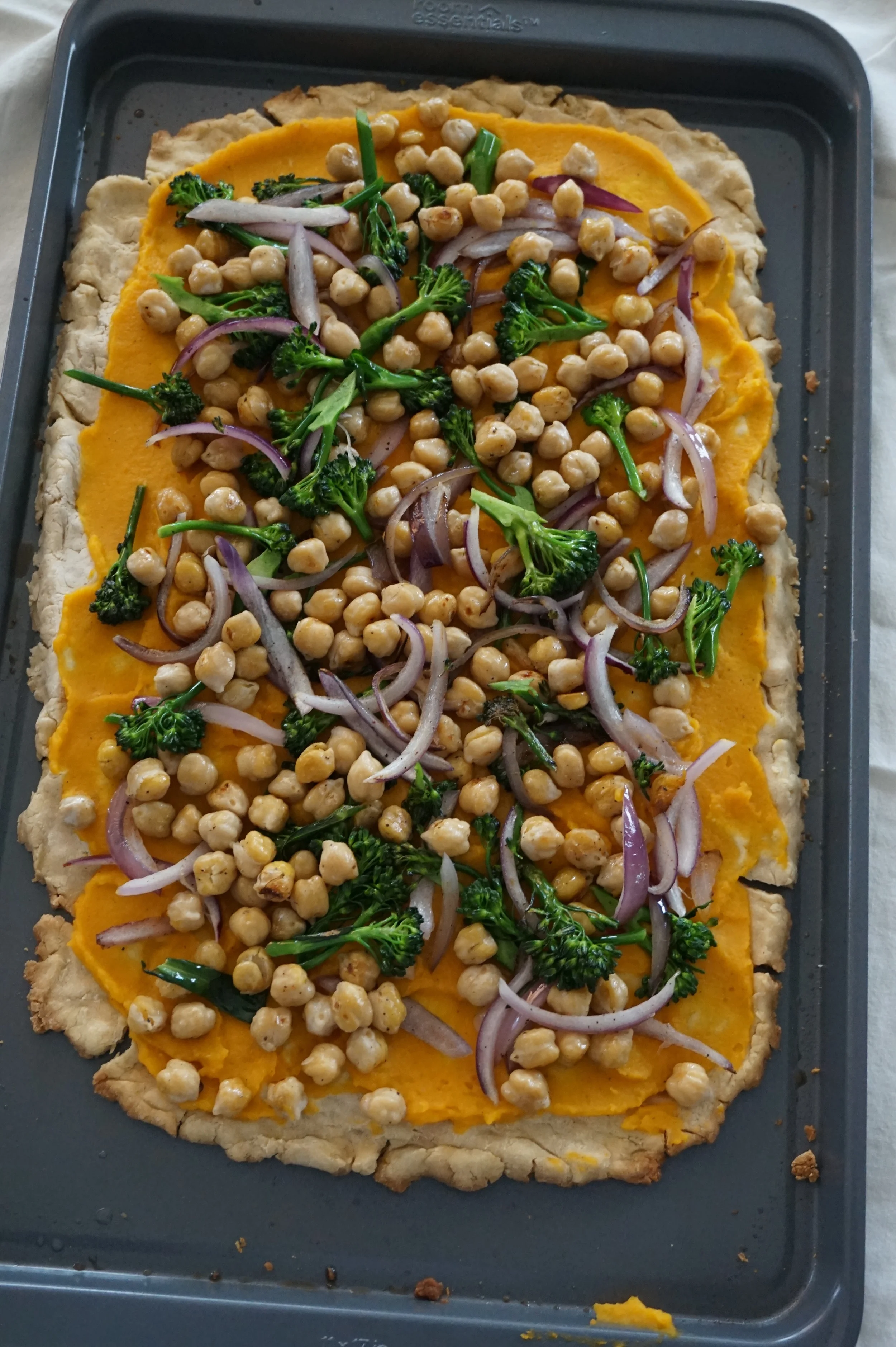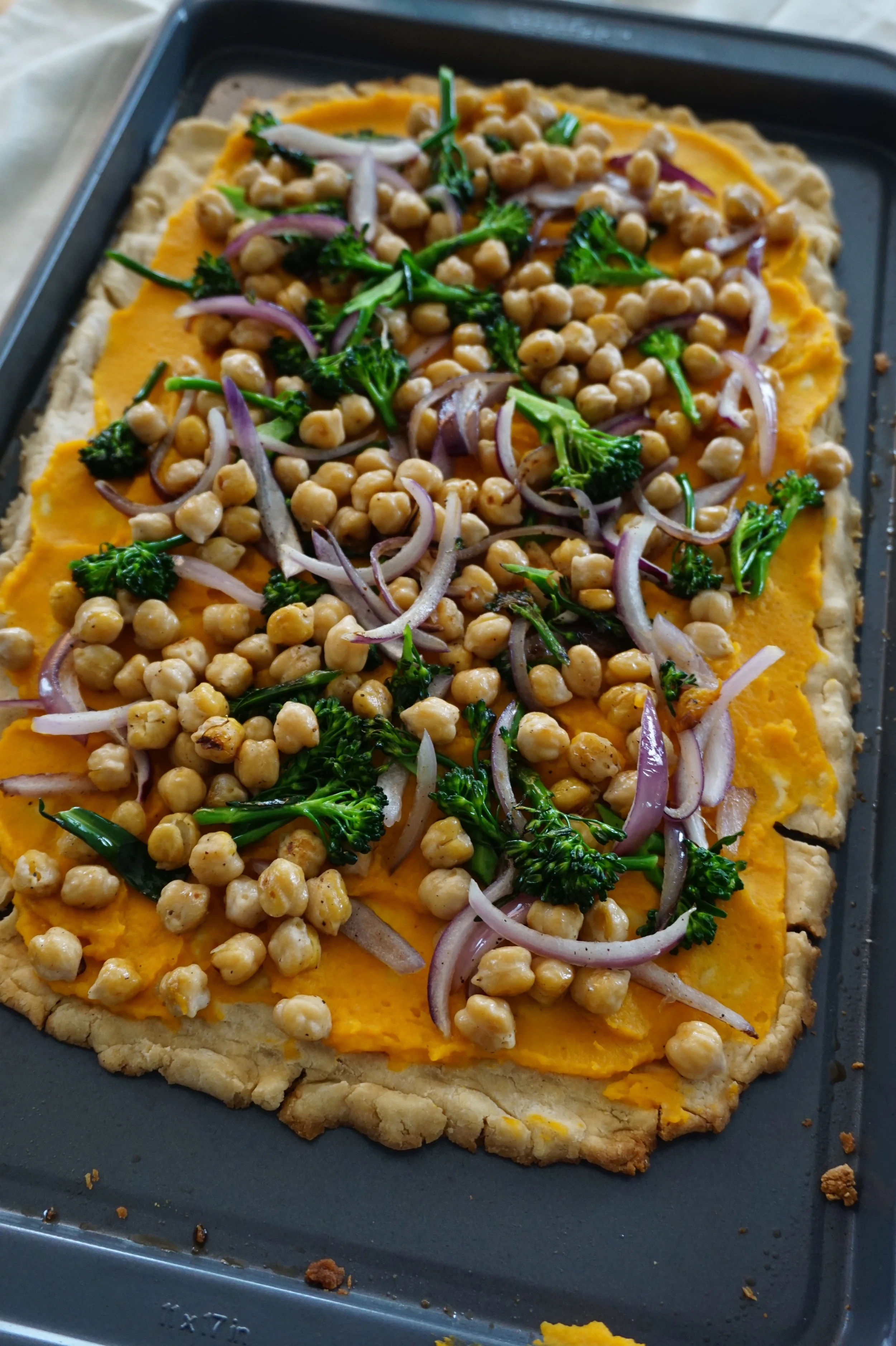 I followed the Minimalist Baker's recipe almost exactly, with broccolini, red onions and chickpeas to get a little protein in, except that I wanted to keep it vegan, so I left out the mozzarella cheese that she added on top. You can definitely add cheese if you'd like!