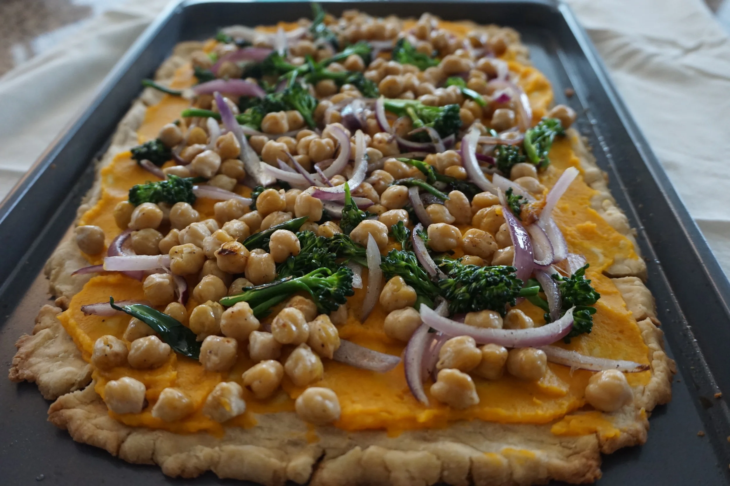 Ok, so I rarely speak of being obsessed with veggie pizzas, but this nothing like I've ever tried before. The butternut squash puree spread as the sauce perfectly compliments the broccolini, onions and chickpeas which decorate the top of the pizza, making it a perfect color and flavor combination!