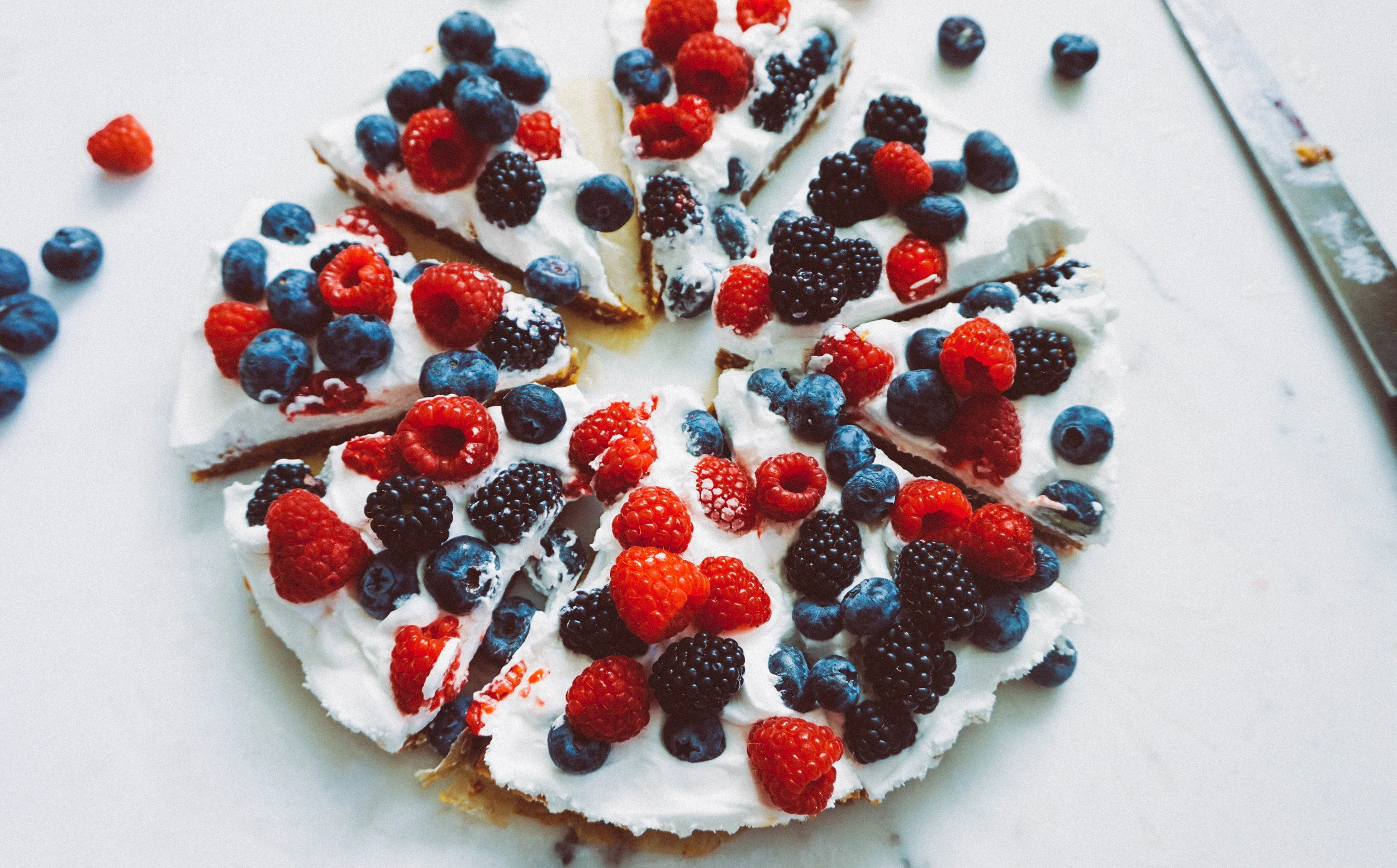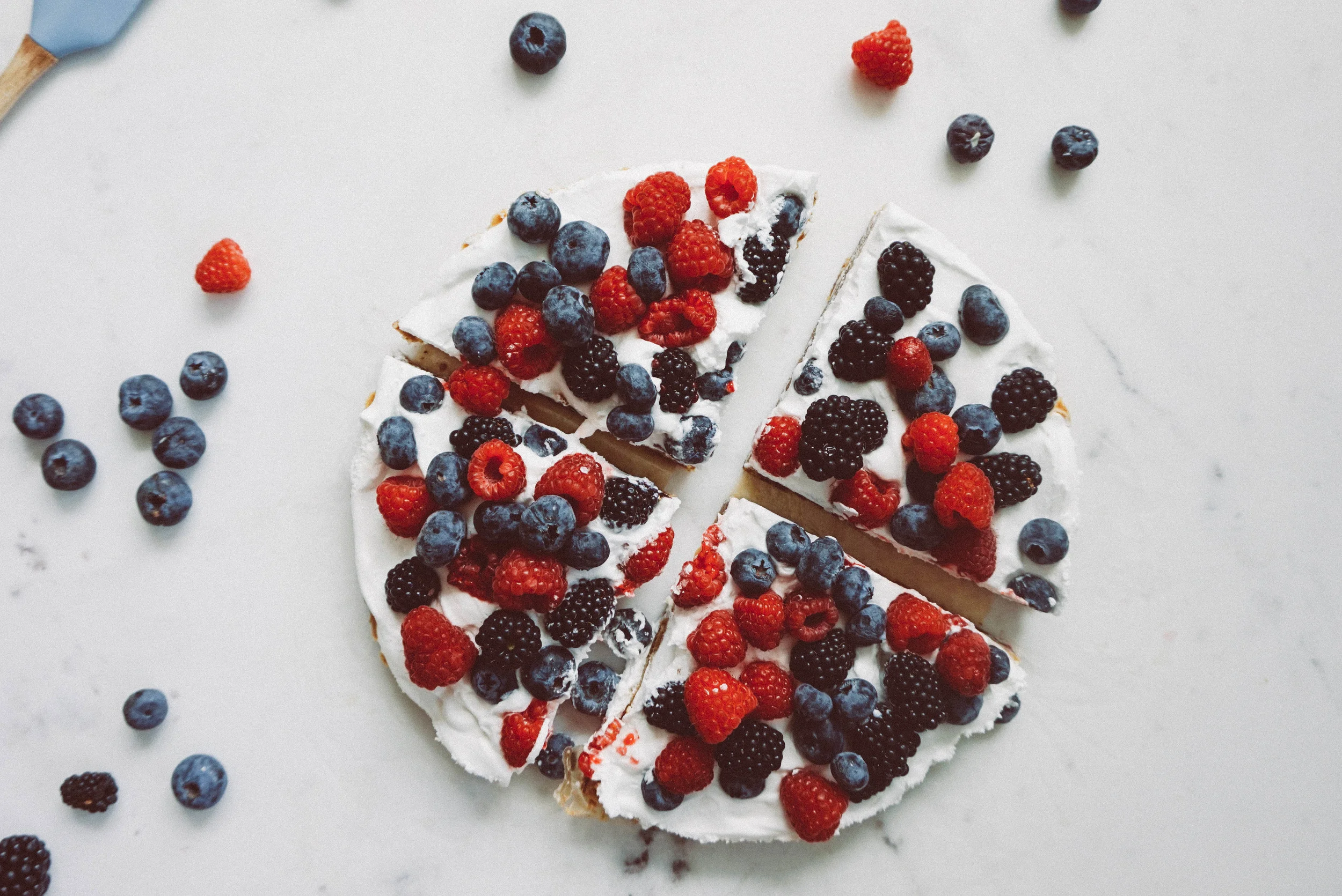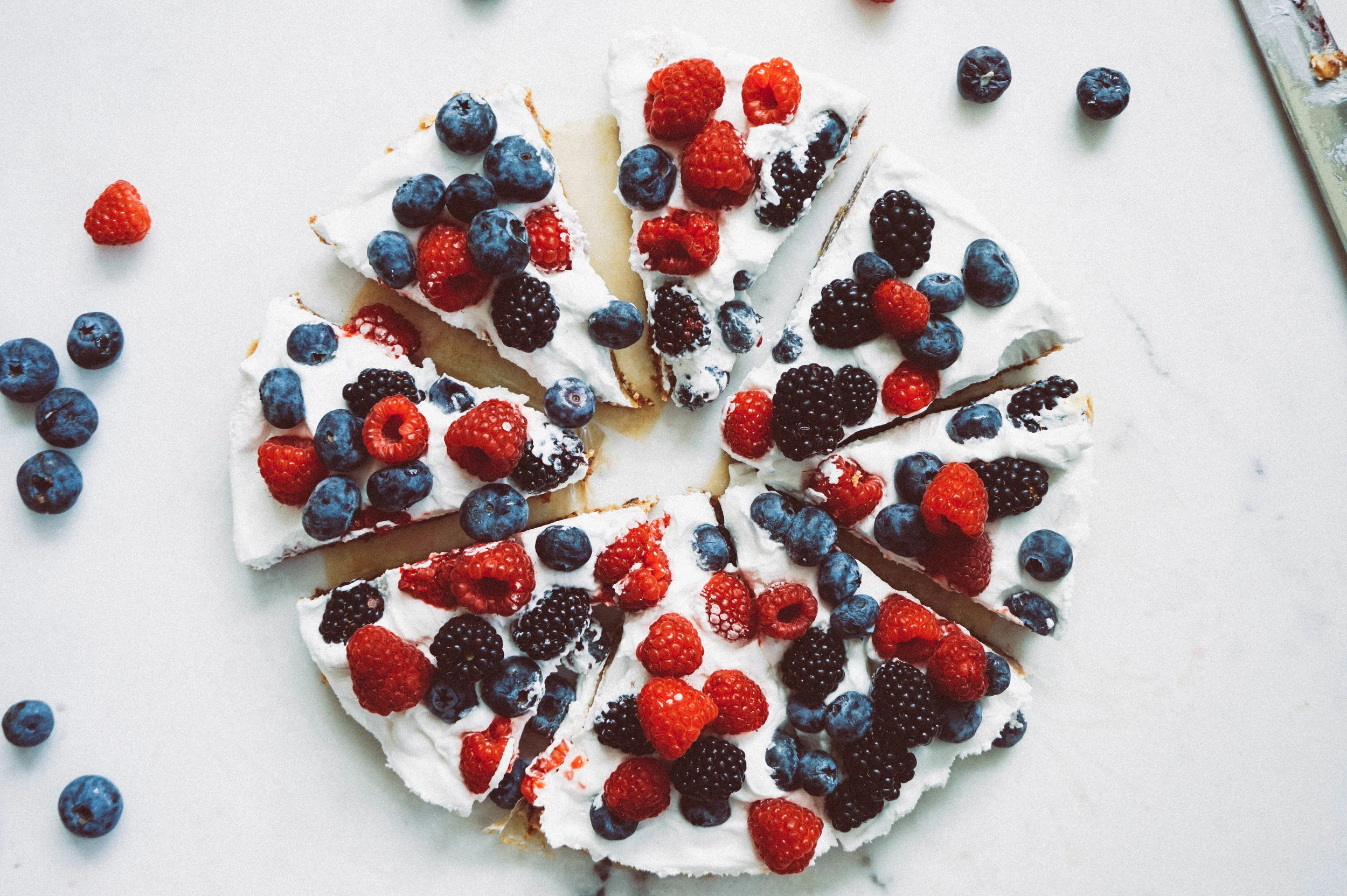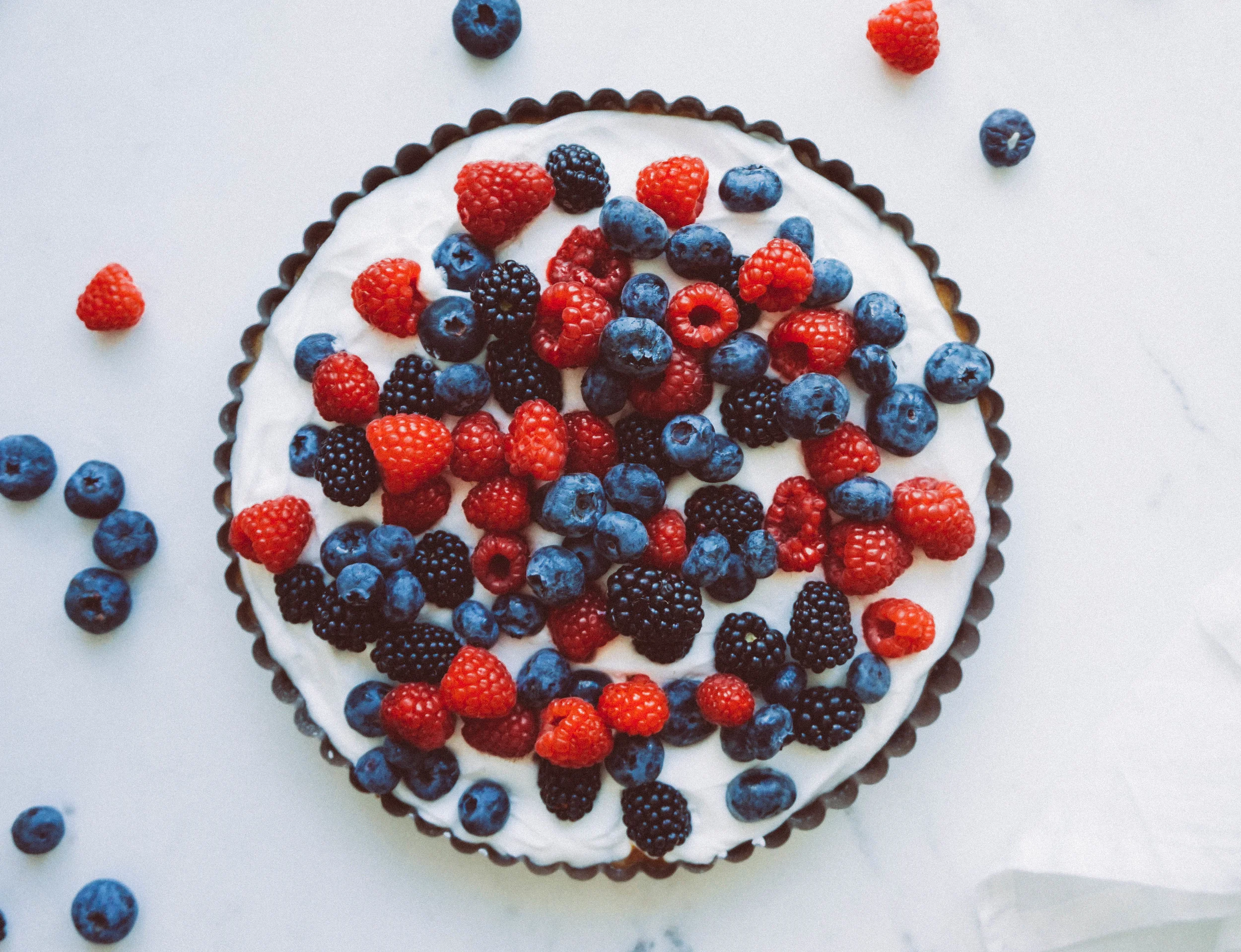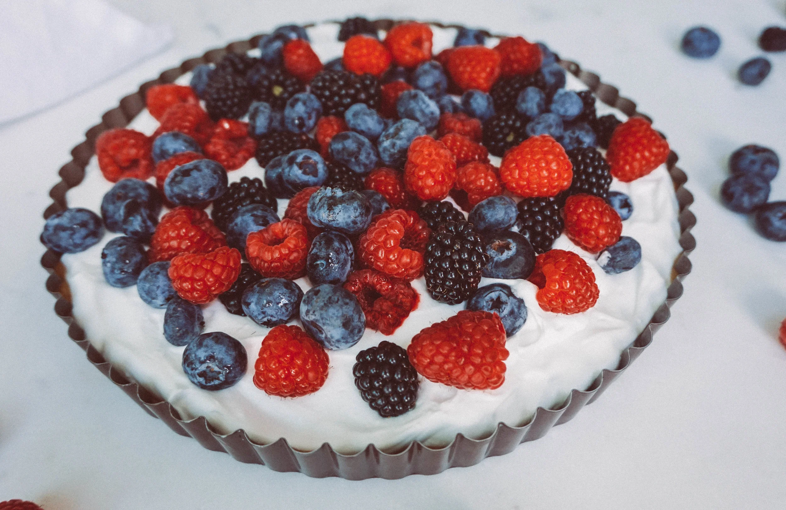 - Remove tart from fridge and dump on your coconut whip. Using a spatula, spread it out into one even layer. Next, add berries.