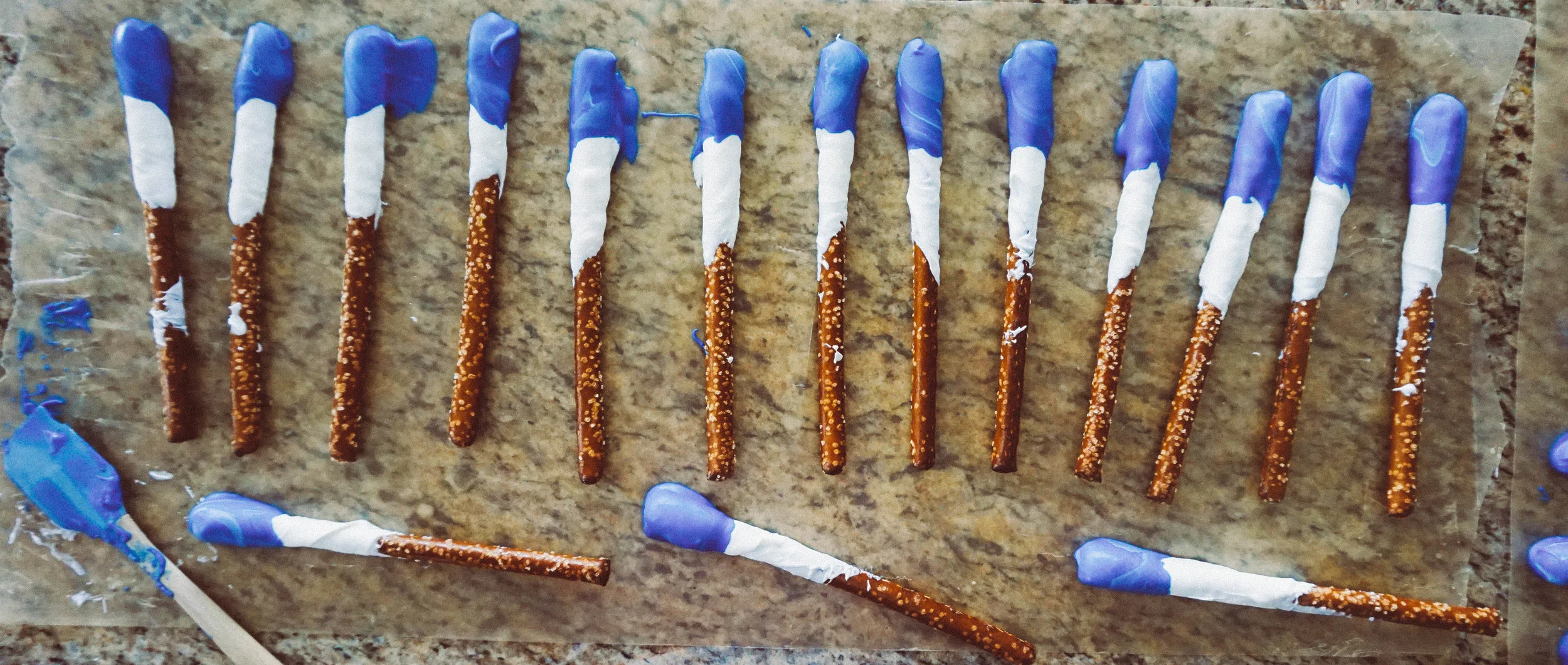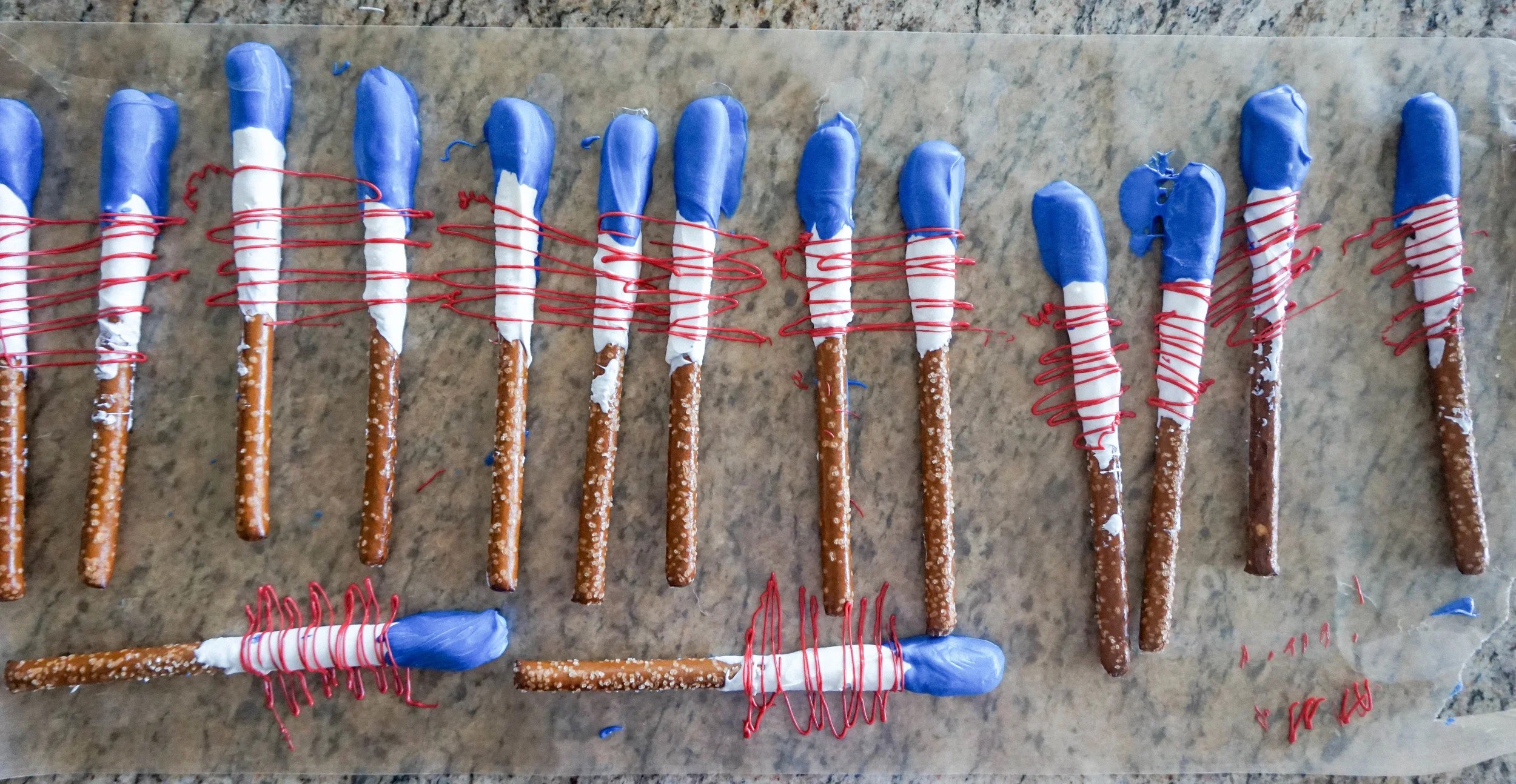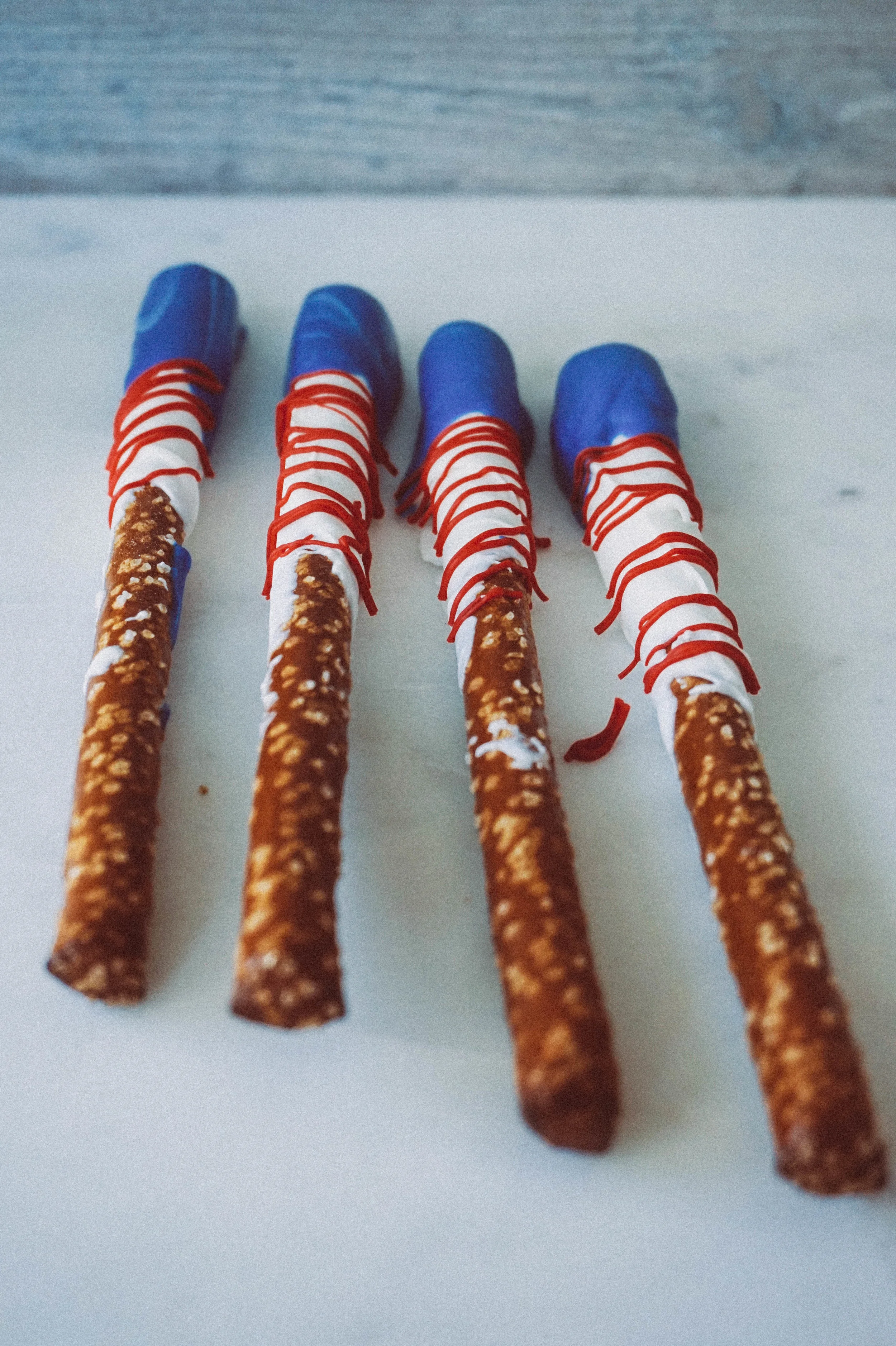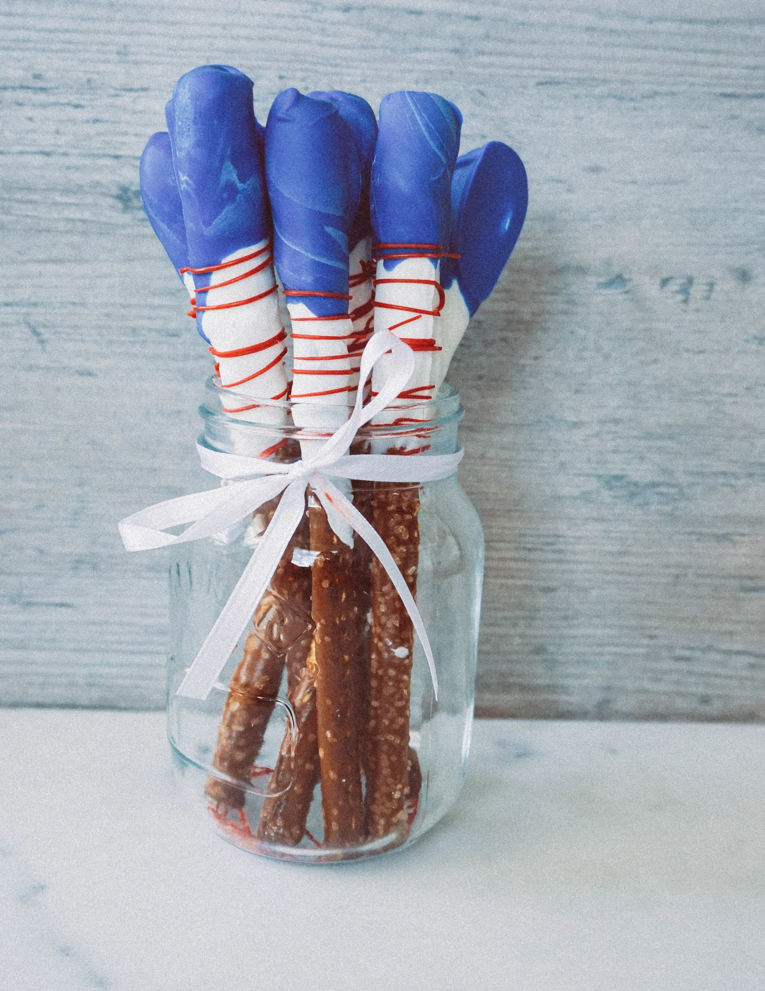 Heres what you need to do: melt the baking chocolate, white first and roll the pretzels in it. Place them on some parchment paper and let dry for about 5 minutes. Then melt the blue chocolate and layer this chocolate over the white. Finally, put some of the red chocolate into a plastic ziploc bag and cut the corner to lightly drizzle over the hardened white chocolate. And...thats it, you're done!! If you want to make these pretzels look extra cute, tie a white ribbon around a mason jar into a bow & stick the pretzels in!